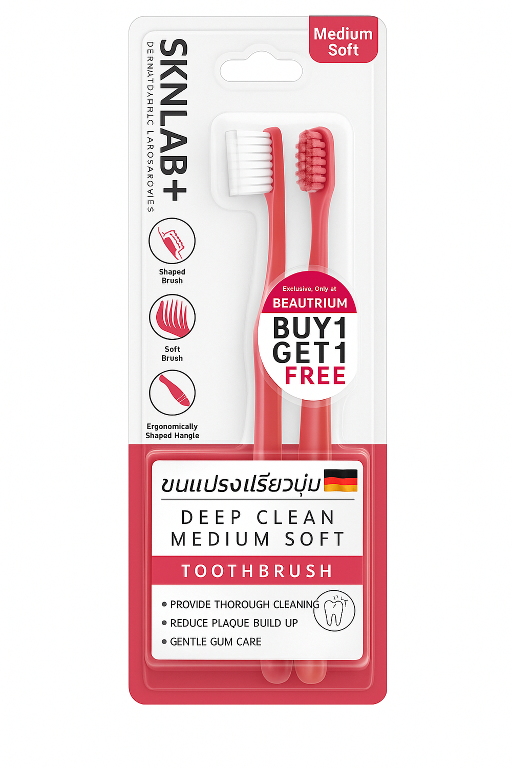Skin Lab The Deep Clean Medium Soft toothbrush comes with high-quality bristles made from PBT material from Germany, with up to 5,000 medium bristles of only 0.1mm, so it is not too hard and not too soft, gentle on the gums and does not hurt the teeth. The 6-sided brush head is specifically designed to handle the teeth. Improved performance in plaque and bacteria removal Therefore, it helps to clean more than a regular toothbrush. The 8-sided Extra Handle Grip allows the brush to be held at 45 degrees, which is the dentist's recommended brushing angle, thus increasing the efficiency of brushing the teeth in the crevices.